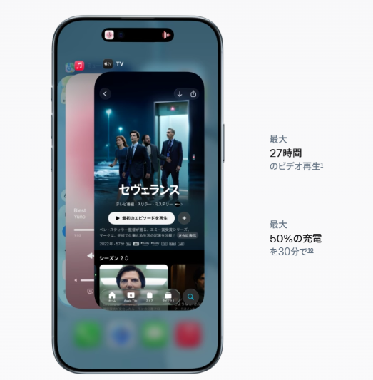 - iPhone 17 Pro:最大33時間動画再生(ストリーミング最大30時間)